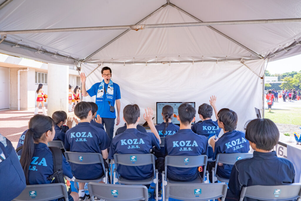FC琉球と県内小中学校とのコラボ企画で、学校行事として生徒たちにスタジアムに来場してもらい、プロのサッカーを生観戦していただきます。単なる試合観戦にとどまらず、試合前にはスタジアム場外の職業体験ブースにて社会学習を実施。沖縄県ゆかりの企業各社の取り組みや職業について理解を深めてもらい、スタジアムが「学びの場」となるプロジェクトです。